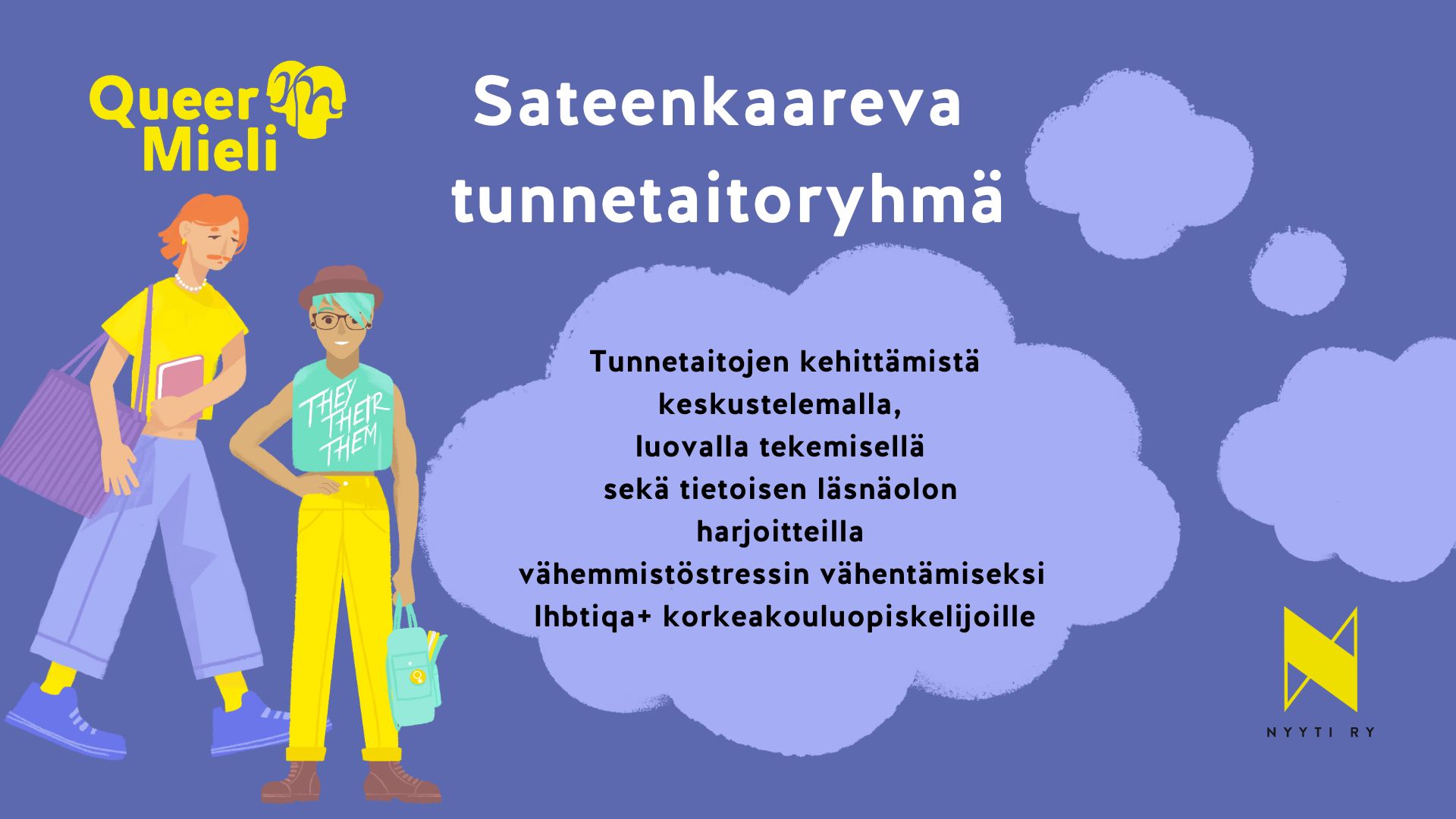 Sateenkaareva tunnetaitoryhmä on suunnattu kaikille lhbtiqa+ -korkeakouluopiskelijoille, jotka ovat kiinnostuneita tunnetaitojensa kartuttamisesta yhteisen keskustelun, luovan tekemisen sekä tietoisen läsnäolon harjoitteiden keinoin. Ryhmässä käsittelemme erilaisia tunteisiin ja tunteiden säätelyyn liittyviä teemoja ja pyrimme löytämään keinoja itsesäätelyyn erityisesti vähemmistöstressiä aiheuttavissa tilanteissa. Tärkeä osa ryhmää on vertaistuen jakaminen ja vastaanottaminen.